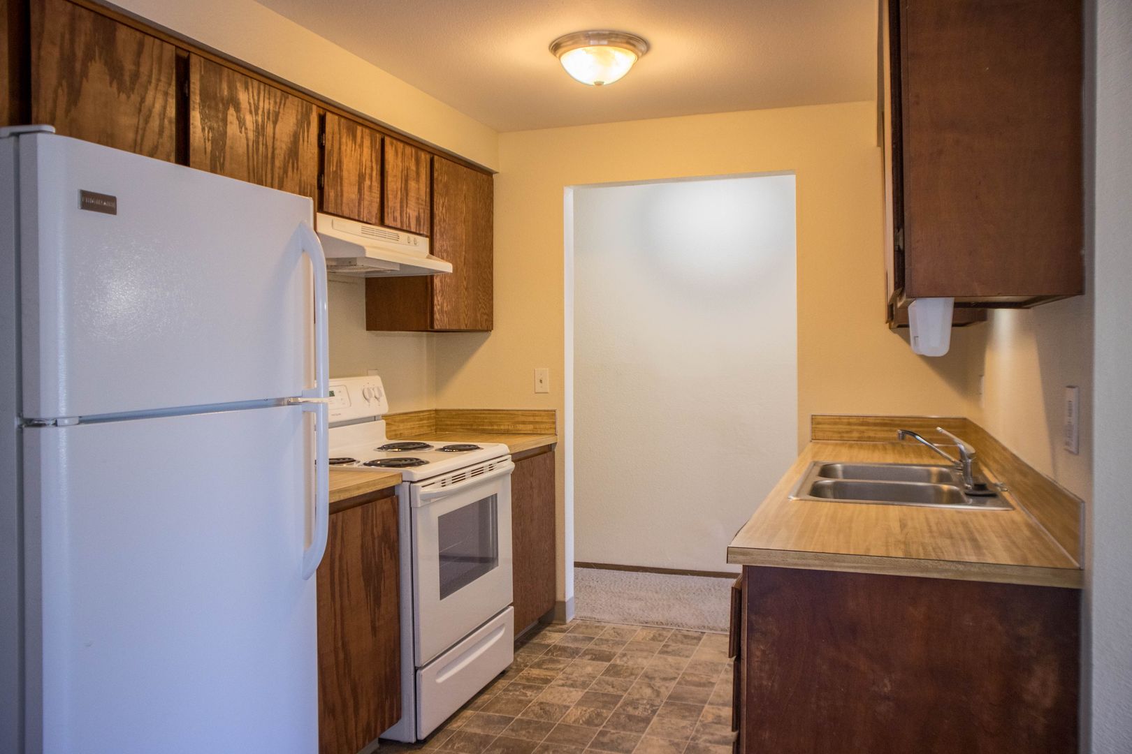 The kitchen comes equipped with a dishwasher, stove, fridge, and plenty of cabinet space.