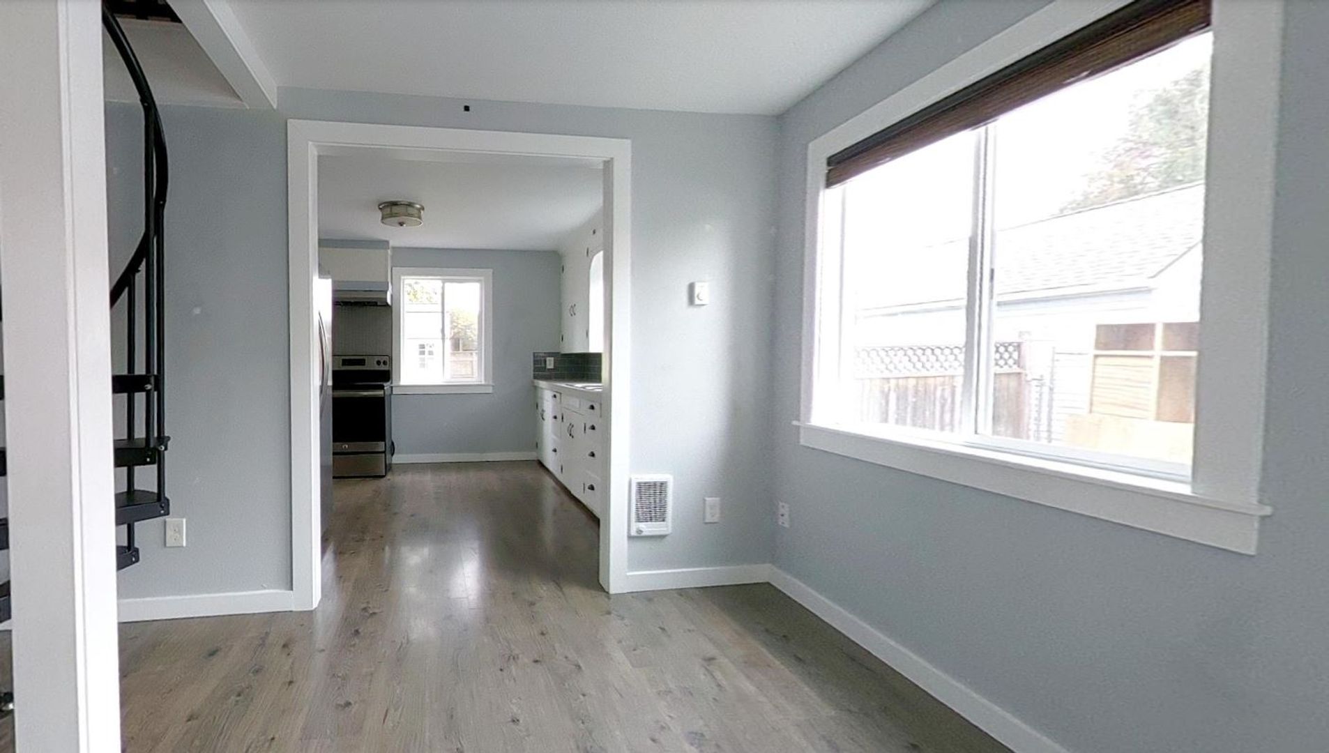 The interior is adorned with laminate floors throughout, adding a touch of elegance to the space. A unique spiral staircase leads to a renovated attic that serves as a second bedroom, offering additional space.